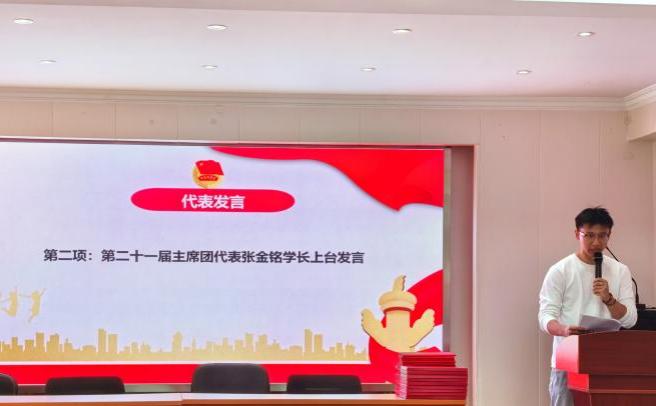 仪式伊始,第二十一届主席团代表张金铭学长率先发言。他回顾了过去一年团队在学生服务、活动组织等方面取得的亮点与成果,并分享了宝贵的工作经验,为新一届主席团提供了有益的借鉴。